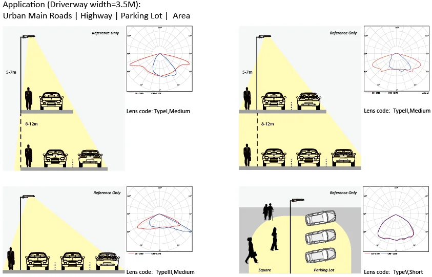 Kulon H4/H5 100 watt solar led street lights optics TypeI,Medium; Typell,Medium; Typelll, Medium; TypeV, Short, which is urban main roads, highway, parking lot, area and etc.